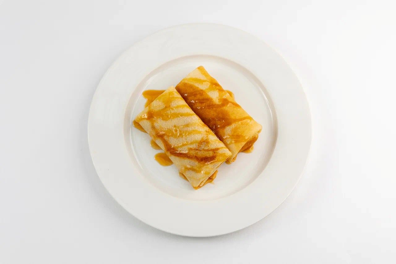 Пшеничные блинчики с кусочками бананов и карамелью.
