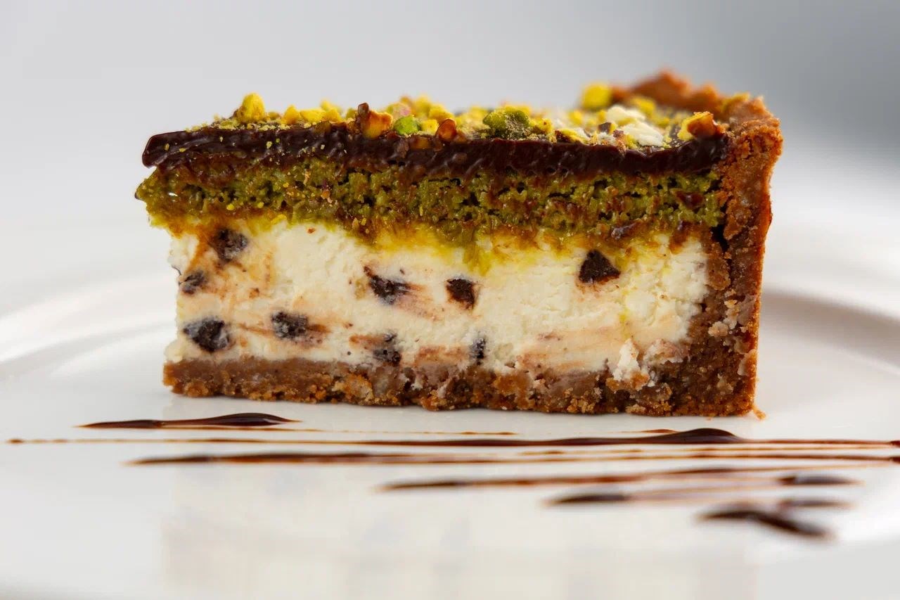 Состав: песочная основа на миндальной муке, творожный крем с кусочками шоколада, тесто катаифи с фисташковой пастой, шоколадный ганаш