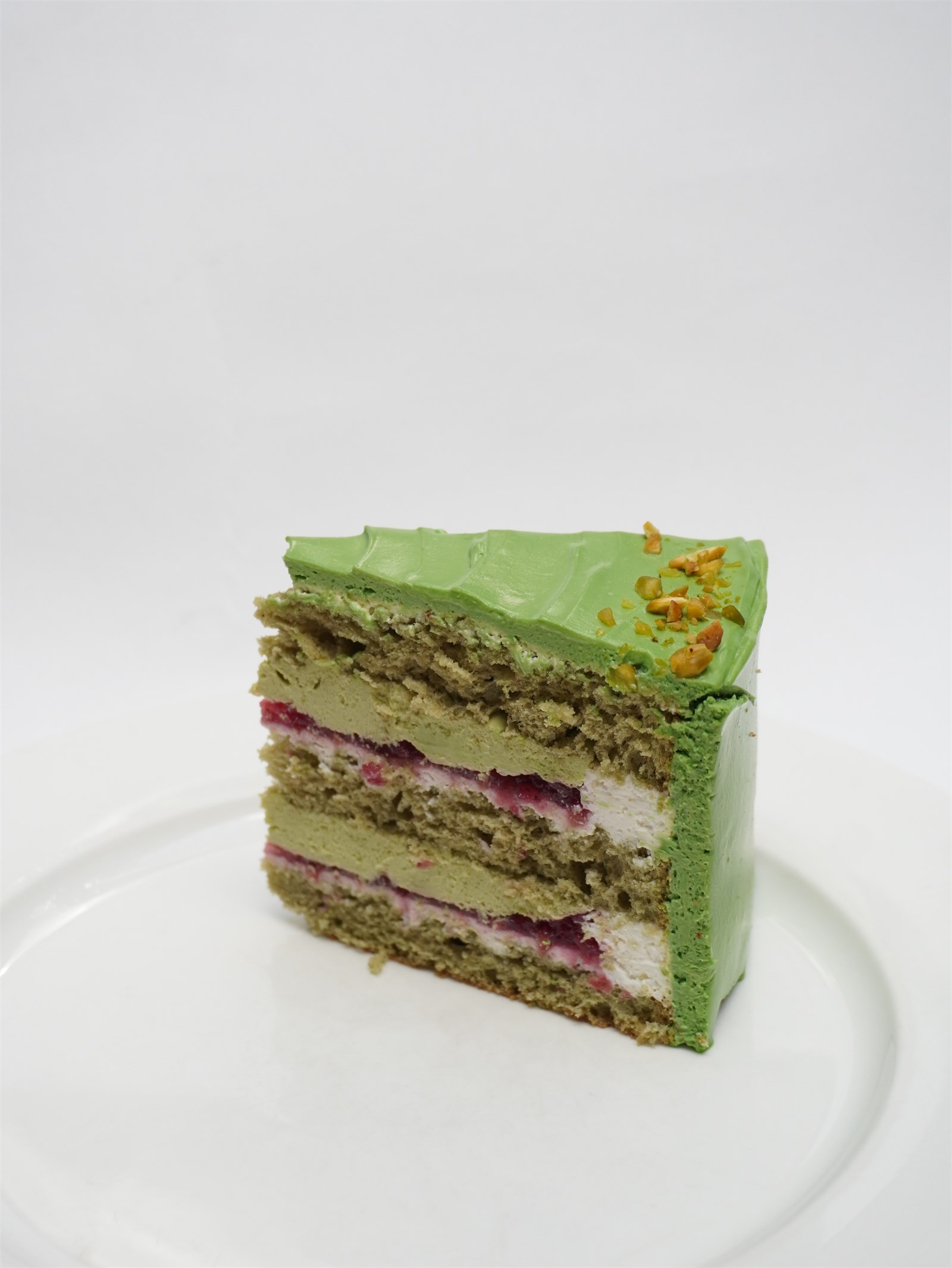 состав: Бисквит с добавлением фисташки, ганаш с фисташкой и белым шоколадом, малиновый джем. Украшен сливочным кремом и фисташками.