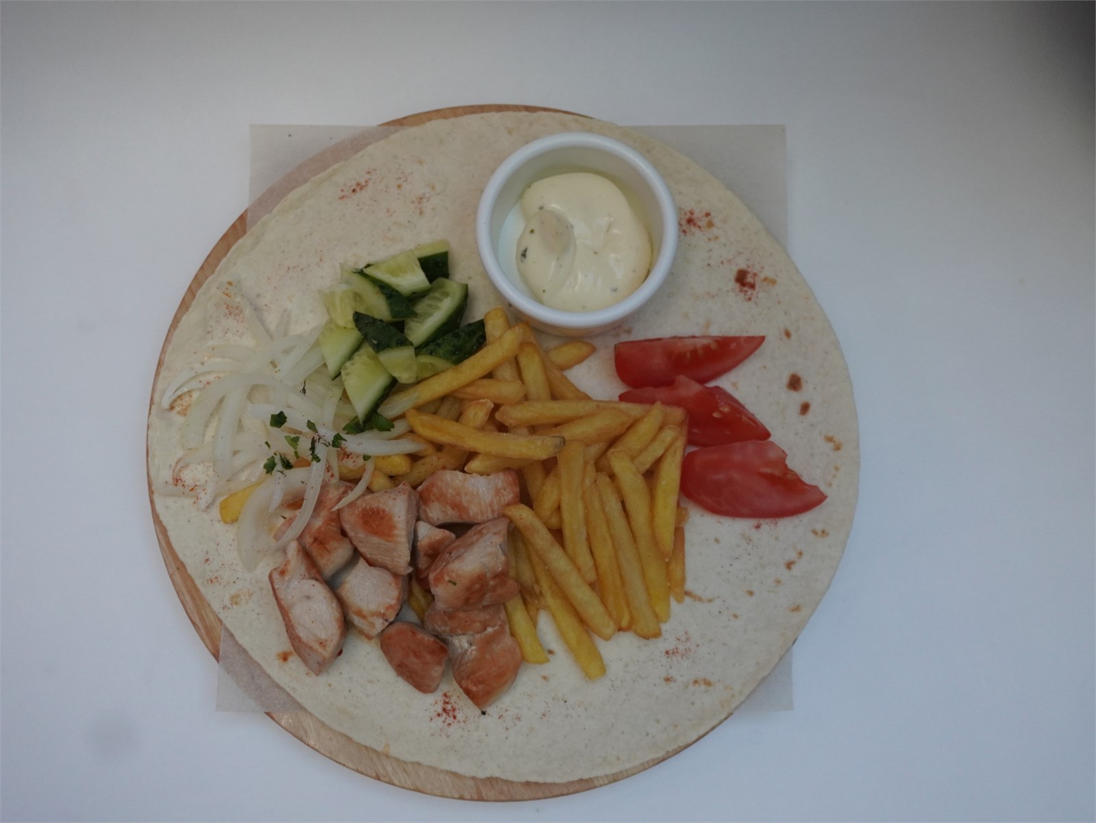 С нежным куриным филе и картофелем фри (подается на лаваше с овощами).