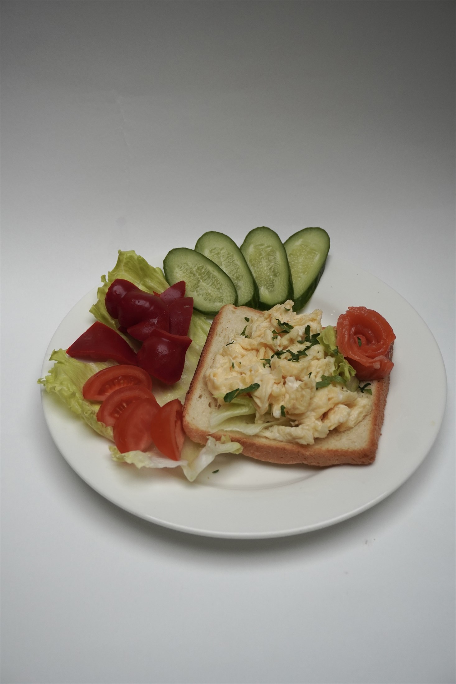 Тост с яичницей болтуньей и лососем слабой соли с сезонными овощами на листике салата.