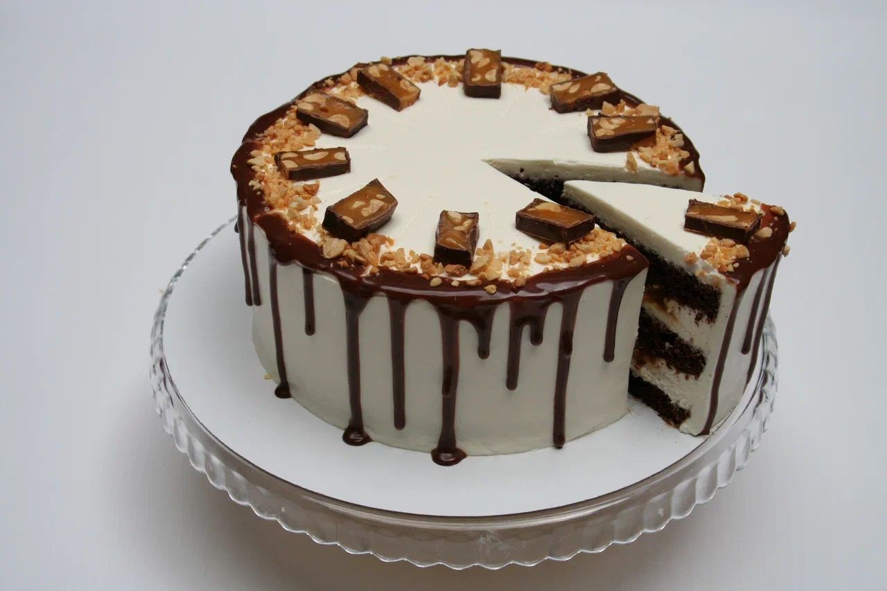 Шоколадный бисквит, крем-чиз, жареный арахис, карамель, шоколадный ганаш.